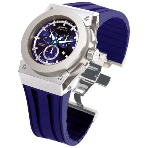 The strong, geometric silhouette and ruggedly handsome detailing make Invicta's Russian Diver Collection Akula Chronograph Watch for men an eye-catching timepiece. The bright blue rubber wristband with deployment push-button clasp closure dramatically contrasts the stainless steel squared case and corresponding round bezel. The blue dial elegantly showcases luminescent hourly indexes, three subdials, a date window at the four o'clock position, and white hour, minute, and second hands. This stately timepiece is water resistant to 330 feet (100 M) and features Swiss-quartz movement.