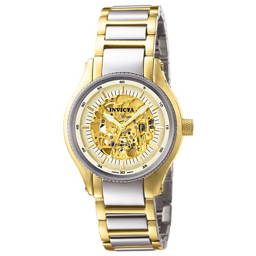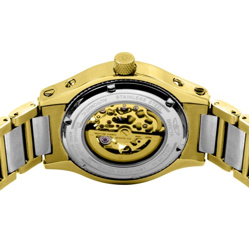 With its intricate skeleton window, the Invicta Men's Signature Collection Automatic Mechanical Two-Tone Watch adds sharp style to your casual wardrobe. Featuring 23-karat-gold plating, the steel watch includes a stationary bezel and a polished link bracelet that's secured with a push-button deployment clasp. A strong mineral crystal shields the two-tone gold and steel dial, which is dominated by a gear-revealing window. The face also includes gold-tone hour markers, slim minute indexes, and black Arabic numerals that mark the time in five-minute increments. Featuring Japanese-automatic movement, the timepiece is water resistant to 165 feet (50 m).